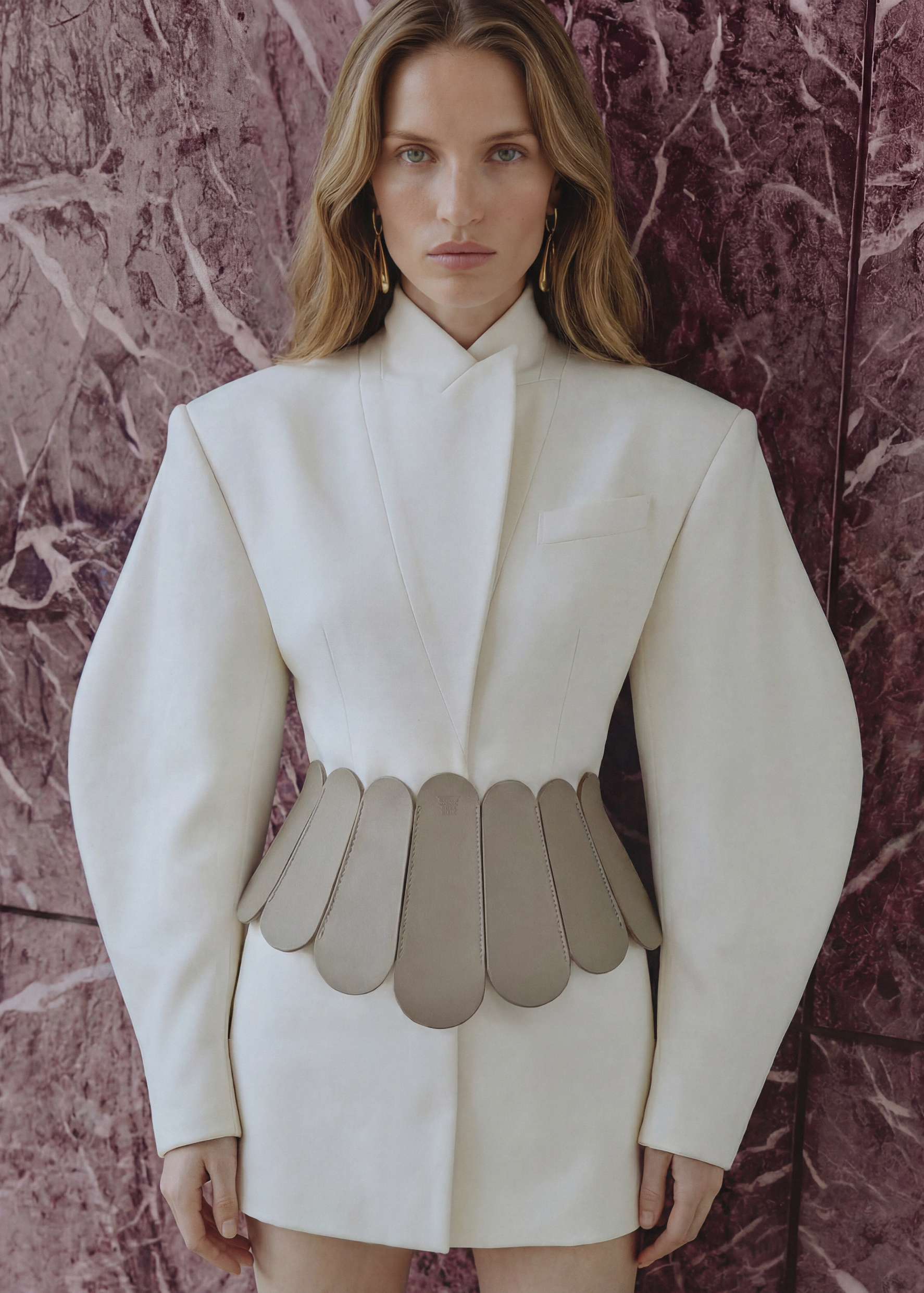 El cinturón Amour es una pieza statement diseñada para llevarse a la cintura, realzando la silueta femenina. Concebido como una interpretación contemporánea de un elemento protector, envuelve el cuerpo casi como una armadura.